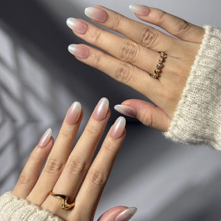 Submerge the nails in hot water for around 8 seconds, remove and pat dry with a clean lint-free towel, then press them firmly against a flat surface until your desired curvature is reached. The heat makes the gel pliable enough to mold to your nail bed curvature. Hold in place for a few seconds until they cool and set.